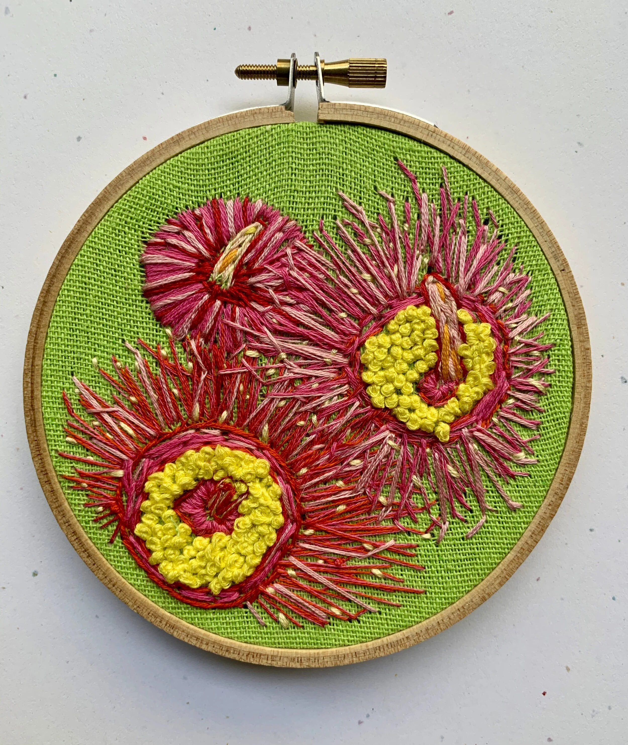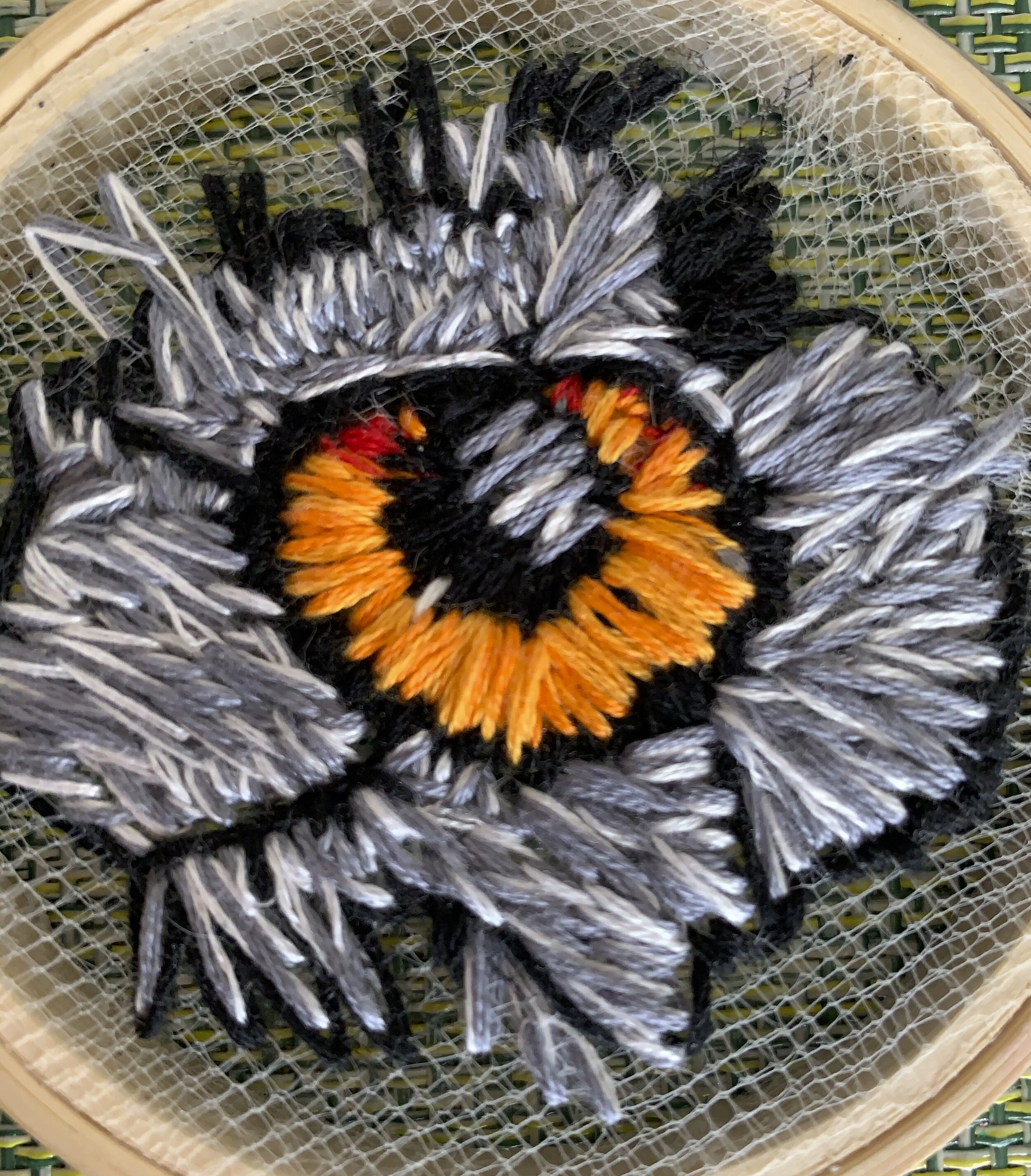 These are my own designs of hand embroidered projects. Each one took anywhere from 20-50 hours to complete depending on complexity and subject matter. I love the feel of the hoop between my fingers and the “pop” of the needle as it punctures the surface of the “canvas.